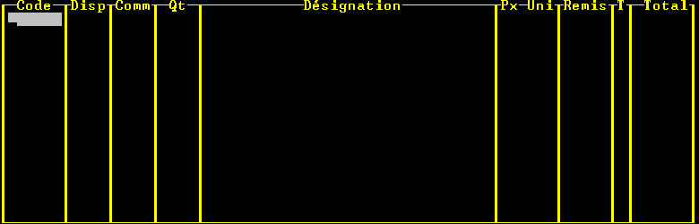 Pour enregistrer la commande, on tape 331 depuis le menu de SAARI (« Création de commande »), puis on appuie deux fois sur Echap pour ne pas sélectionner de fournisseur. On arrive alors sur une grille vide :