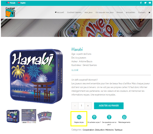 Exemple ci-dessous avec le jeu Hanabi. Sur la page de l’éditeur (Cocktail Games) du jeu, vous avez accès au téléchargement des règles.