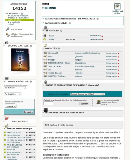 Lorsque vous êtes connectés, un menu apparaît à gauche de l’écran avec des options supplémentaires, qui vont changer en fonction de l’endroit où vous vous situez sur le site. Par exemple si vous consultez une fiche article vous aurez la possibilité de la consulter depuis l’interface SPIP, de la modifier (voir plus haut pour la différence entre ces deux modes), de changer l’image principale, ou encore d’accéder à l’aide en ligne.
