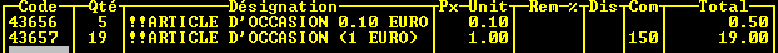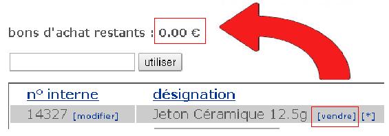 – sélection du raccourci « vendre » dans le cadre « désignation » : l’espace « Bons d’achat restants » est crédité du prix de vente de l’article réduit de 20%.