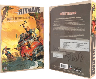 L’action de Bitume se déroule 40 ans après le cataclysme de la comète de 2026. Les survivants se sont regroupés en tribus issues principalement d’une version fantasmée de la pop culture des années 1980. Punks, file du métal, Yankees, indiens et autres, autant de tribus plus déglinguées les unes que les autres, dans une France ruinée dévastée et dangereuse. Cette boîte contient tout ce dont vous avez besoin pour commencer rapidement : un livret de règles ; un livret de 4 scénarios prêts à jouer ; un écran souple du Meneur de Jeu ; 6 fiches cartonnées A4 avec 5 PJ prétirés et une fiche de récap’ des persos prétirés pour le MJ ; un « flip-mat » recto-verso format A2 ; un « punchboard » ; un set de dés polyédriques (d4, d6, d8, d10, d12 et d20).