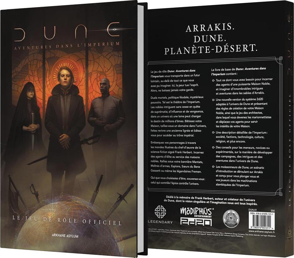 Le jeu de rôle Dune : Aventures dans l’Imperium vous transporte dans un futur lointain, au-delà de tout ce que vous avez pu imaginer. Ici, la peur tue l’esprit. Alors, ne baissez jamais votre garde. Duels mortels, politique féodale, mystérieux pouvoirs. Tel est le théâtre de l’Imperium. Les nobles intriguent sans cesse en quête de suprématie, d’influence et de vengeance, dans un univers où une lame peut changer le destin de millions d’âmes. Bâtissez votre Maison, taillez-vous un domaine dans l’univers, faites revivre une ancienne lignée et battez-vous pour accéder au trône impérial. Embarquez vos personnages à travers les mondes illustres du chef-d’œuvre de la science-fiction signé Frank Herbert. Incarnez des agents d’élite au service des maisons nobles. Ralliez sous votre bannière Mentats, Maîtres d’armes, Espions, Sœurs du Bene-Gesserit ou même les légendaires Fremen. Qui que vous choisissiez d’être, souvenez-vous : celui qui contrôle l’épice contrôle l’univers. Le livre de base de Dune : Aventures dans l’Imperium contient : Tout ce dont vous avez besoin pour incarner des agents d’une puissante Maison Noble, et imaginer d’innombrables intrigues et aventures dans les sables d’Arrakis. Une nouvelle version du système 2d20 adaptée à l’univers de Dune et présentant des règles de création de votre Maison Noble, ainsi que le jeu des architectes, dans lequel vous devenez les marionnettistes et déplacez vos agents pour servir les intérêts de votre Maison. Une description détaillée de l’Imperium : société, factions, technologie, culture, religion, et plus encore. Des conseils pour les meneurs, novices ou expérimentés, sur la manière de développer des campagnes, des intrigues et des aventures dans l’univers de Dune. Les moissonneurs de Dune, un scénario d’introduction se déroulant sur Arrakis et conçu pour vous plonger vous et vos joueurs dans les machinations alambiquées de l’Imperium.