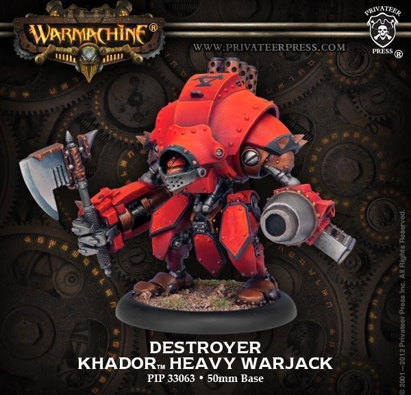 Les mechaniks du Khador construisent leurs warjacks pour durer. Le Juggernaut présente une masse imposante de blindage et manie une hache de glace qui enferme sa victime dans un cercueil de givre. Ce châssis robuste a donné naissance à d’autres warjacks de référence comme le Destroyer, dont les obus fusent au dessus des troupes ennemies pour détruire les lignes arrières. Le Marauder a aussi été construit à partir de cette base. Il est équipé de pistons qui lui permettent de produire des impacts destructeurs sur les warjacks ennemis, qui se retrouvent propulsés en arrière avec une facilité déconcertante. Un autre warjack dérivé de ce châssis est le Decimator, construit pour mettre à terre les cibles blindées grâce à son canon avant de les ouvrir en deux grâce à sa scie circulaire.