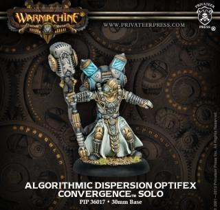 Among the most important but demanding tasks carried out by the living priests of the Convergence is the deployment of algorithmic dispersion arrays—devices that increase the reach of a warcaster’s arcane spells well beyond normal tolerances. By carefully modulating the dispersion array’s frequencies, the optifex acts as a transmitter through which the warcaster can bolster his battlegroup or strike down enemy targets.