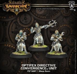 Eager to advance the Great Work, flesh-and-blood priests of the Convergence take to battle alongside the clockwork soldiers of their goddess at tremendous personal risk. Each optifex in a directive carries a plethora of tools both to repair vessels and vectors and to effect rapid recalibrations in response to shifting combat needs. In combat these priests stay in constant motion, each a part of a carefully orchestrated plan to service the cogs in Cyriss’ machine of war.