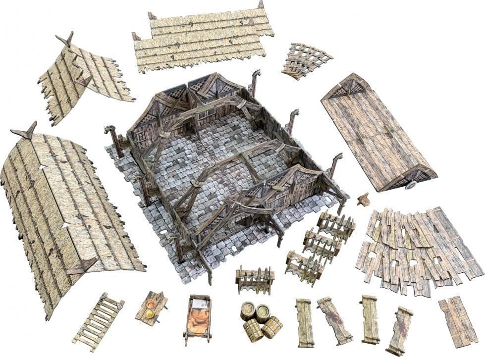 De construction primitive mais solide, les cultures guerrières se rassemblent dans ces longues salles pour festoyer et boire nuit après nuit. Ils abritent souvent le dirigeant local et les réunions du conseil des anciens ont lieu dans leurs murs. Cette boîte contient tout ce dont vous avez besoin pour construire une grande salle de banquet au toit de chaume, adaptée à de nombreux jeux fantastiques et historiques de 28-35 mm. L’intérieur est détaillé et le toit est amovible. L’ensemble est livré avec des meubles et un terrain de dispersion pour accessoiriser votre table de jeu. La plupart des pièces sont modulaires et peuvent être assemblées dans différentes combinaisons ou mélangées et assorties au reste de la gamme. Le décor est fourni à plat sur un carton de haute qualité et densité, imprimée en couleur des deux côtés, donc aucune peinture requise ! Le terrain nécessite un assemblage et certaines pièces plus petites nécessiteront de la colle.