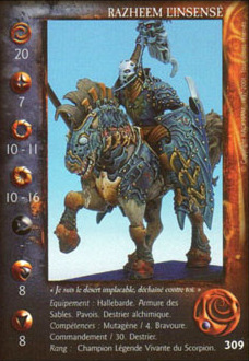 Premier clone de cette puissance sorti des cuves de Syharhalna, Razheem fut créé pour commander les armées de Dirz. Doté d’une force et d’une résistance hors du commun, il ne trouve sa véritable valeur qu’au centre de batailles titanesques. La simple apparition de la silhouette de l’Insensé au milieu d’une tempête de sable est bien souvent suffisante pour faire naître une terreur sans nom dans le c¦ur de ses ennemis.