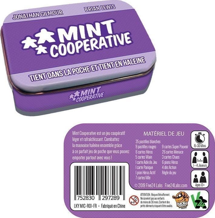 Mint coopérative est un jeu coopératif léger et rafraichissant. Combattez la mauvaise haleine ensemble grâce à ce parfait jeu de poche que vous pouvez emporter partout avec vous ! Votre mission est simple : Protéger Mintopia City et les autres villes du Comté de Mortimer des plans machiavéliques du S.T.O.M.A, le Syndicat pour la Terreur Odontologique et les Maladies Associées. Mint Cooperative est un jeu coopératif léger et rafraîchissant avec des règles faciles à apprendre et un gameplay stratégique. Sa taille compacte le rend facile à mettre dans votre poche pour l’emporter n’importe où. Avec sa règle accessible, Mint Cooperative est un excellent outil pour initier les nouveaux joueurs au style de jeu coopératif.