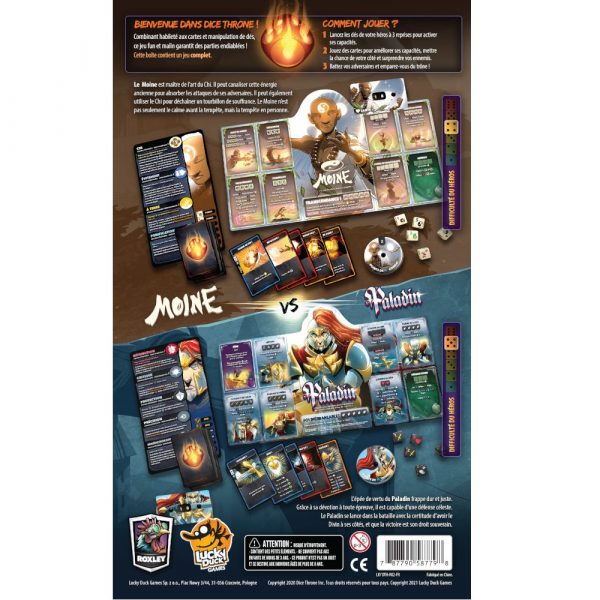 Chaque année, le Roi Fou organise un tournoi de champions, avec comme enjeu le plus grand prix qu’un héros pourrait remporter : le Trône. Serez-vous assez audacieux pour le prendre ? Choisissez le héros qui vous attire le plus, certains sont plus complexes à prendre en main, mais ils sont tous aussi forts les uns que les autres ! Lancez autant de dés que vous le souhaitez, jusqu’à 3 fois pour activer l’une de vos capacités. Utilisez les cartes d’améliorations pour booster vos capacités de héros tout au long de la partie ! Jouez vos cartes Action stratégiquement pour modifier vos dés et surprendre votre adversaire ! Battez vos adversaires en faisant tomber leur vie à 0 et prenez le trône ! Dice Throne est un jeu compétitif ou en équipe, proposant des combats à base de dés et de pouvoirs spécifiques à chaque personnage.