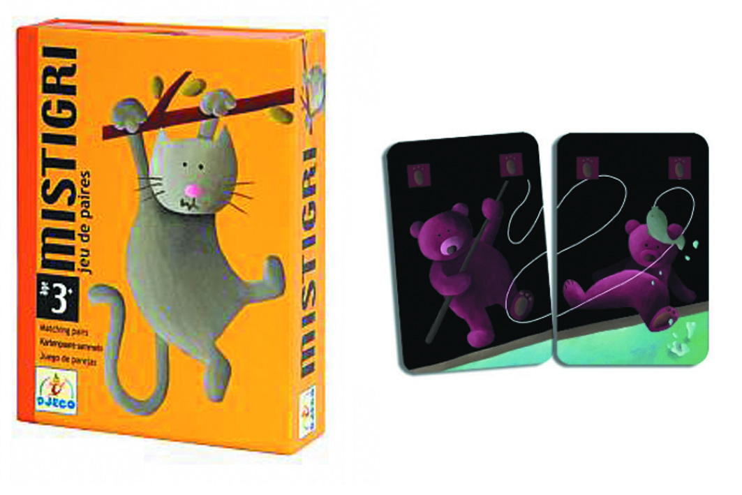 Sur fond noir, des lucioles lumineuses, des cochons économes et leur tirelire, des moutons tricoteurs ou un âne puni d’un bonnet d’âne pour avoir raté une addition. Tout le jeu et le plaisir est d’assembler 2 cartes d’un même animal pour découvrir une jolie scène souvent humoristique. Mais attention à ne pas garder le chat Mistigri dans ses mains en fin de partie.