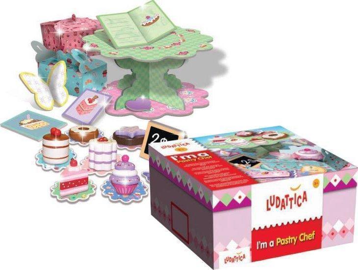La boîte comporte tout le nécessaire pour dresser, envelopper et emballer tes gourmands gâteaux. le jeu inclut un ensemble de huit douceurs en bois et plein de matériel découpé en papier et carton.