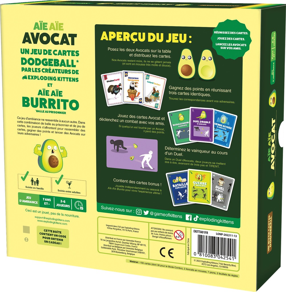 Un jeu d’ambiance survolté et délirant ! Les deux avocats en mousse sont posés au centre de la table, chacun reçoit un paquet de cartes qui constitue sa pioche et en prend 5 en début de partie. Dès le signal tout le monde pioche des cartes dans son paquet et se défausse sur la pioche de son voisin ! Les cartes tournent ainsi de joueur en joueur. Si vous parvenez à avoir en main trois cartes Combat identiques, posez-les en proclamant le type de Combat. Deux joueurs vont-ils s’affronter en duel ? Tour le monde va-t-il se précipiter sur les avocats ? Si vous êtes touchés, c’est 1 point KO reçu et donc un point en moins ! La partie se déroule en deux manches, si deux joueurs différents en remportent chacun une, un duel final détermine le vainqueur. Un mode de jeu propose des cartes spéciales pour des parties en combinaison avec Aïe Aïe Burrito.