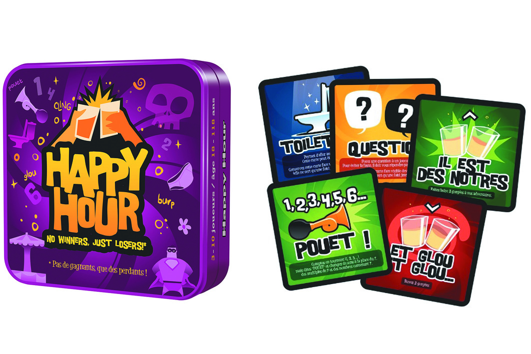 Le joueur qui tirera la 4e et dernière carte « Happy Hour » perd la partie et se voit obligé de boire cul sec le verre central… au contenu préalablement choisi par les autres joueurs !
