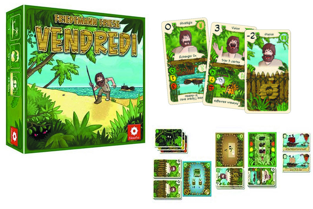 Dans Vendredi, Robinson est représenté par une pile de cartes aux usages multiples. Vous devez perfectionner cette pile afin que Robinson remporte le combat contre deux pirates coriaces à la fin de la partie !