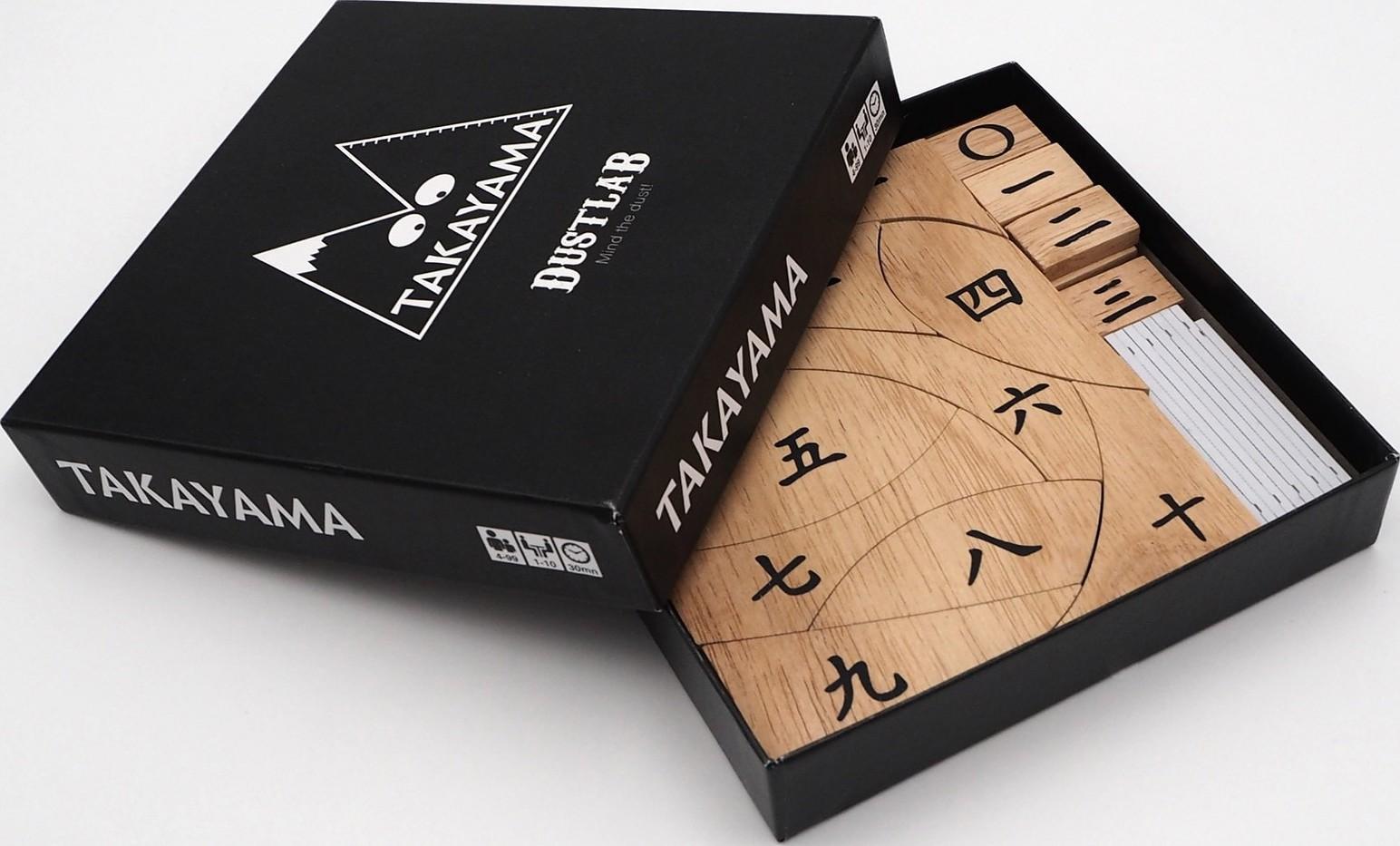 Takayama est un jeu d’équilibre sans nombre limite de joueurs. Le but est de construire les plus grandes montagnes en empilant les différentes pièces de bois, les mesurer et faire la somme de ces mesures pour atteindre le sommet. Le gagnant est le premier à atteindre 100cm en cumulant ses montagnes. On construit ses montagnes chacun son tour. Le plus petit joueur en taille commence en plaçant la base de la montagne (plaque de bois) puis il retourne au hasard un premier jeton, prend la pièce de bois avec le symbole correspondant et la place sur la base en bois. Le joueur a le droit de la placer dans la position qui lui plaît, mais toujours sur la tranche ! Ensuite, il retourne un second jeton et place à nouveau la pièce de bois correspondante sur la pièce précédente pour construire sa montagne et ainsi de suite. Le joueur peut à tout moment décider de poursuivre ou d’interrompre sa construction, parfois il est préférable de s’arrêter car si une pièce tombe c’est perdu pour vous ! S’il est satisfait de sa montagne, il s’arrête, en mesure la hauteur et inscrit le résultat. Le joueur suivant peut commencer, le premier joueur qui atteint un cumul de 100cm gagne la partie. Il existe plusieurs variantes pour ce jeu ; le jeu en équipe, jouer en fixant un nombre maximum de tour en début de partie, jouer le chronomètre pour chaque joueur…