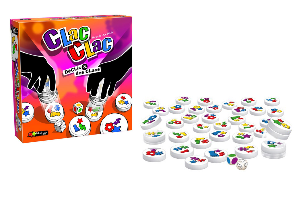 Chacun des 36 disques étalés sur la table combine 3 symboles reproduits dans 3 couleurs différentes. A chaque tour, on lance 2 dés qui indiquent quel symbole trouver et dans quelle couleur. Puis tous les joueurs tentent simultanément de s’emparer d’un maximum de disques reproduisant cette combinaison. Les disques sont aimantés : « Clac ! Clac ! » ils s’empilent comme par magie, mais on ne peut utiliser qu’une seule main ! Il faut aller très vite pour les empiler sans se tromper, sinon gare aux pénalités… Puis on entame un nouveau tour. Quand tous les disques ont été ramassés, la plus haute pile indique le vainqueur. Ayez l’oeil vif, l’esprit clair et la main habile !