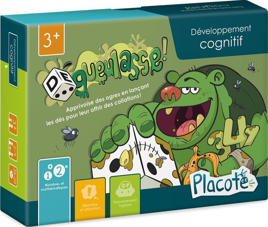 Objectif : Dénombrement et calcul Apprivoise le plus d’ogres possible en leur offrant des collations à leur goût ! Pour ce faire, tu dois obtenir, avec un ou deux dés, un nombre qui correspond à celui sur la carte de l’ogre. Montre tes talents de cuisinier et deviens le maitre de ces adorables ogres de compagnie ! DÉgueulasse ! est conçu pour aider les enfants de 3 ans à 9 ½ ans à développer leur compréhension des nombres et leurs habiletés de calcul. Les trois niveaux de difficulté en font un jeu évolutif qui tient compte de l’ordre d’acquisition des différents concepts liés aux nombres. Avant d’entrer à l’école, l’enfant construit ses propres connaissances sur les nombres. Cela lui servira de base pour l’apprentissage des mathématiques. Il est donc pertinent de lui faire vivre des expériences liées aux nombres pendant cette période, et de poursuivre la stimulation tout au long de son développement pour consolider ses habiletés. DÉgueulasse ! permet à l’enfant de développer sa compréhension des nombres et ses habiletés de calcul en lui faisant vivre des expériences ludiques et stimulantes. Les trois niveaux proposés en font un jeu évolutif qui tient compte de l’ordre d’acquisition des différents concepts liés aux nombres chez les enfants.