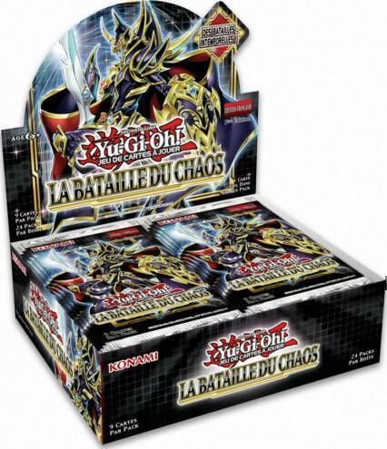 Ce set de 100 cartes propose de nouvelles cartes qui fonctionnent avec Yugi Muto’s Dark Magician, notamment un nouveau monstre Rituel, un nouveau monstre Fusion, et une nouvelle forme Dragon de Timaeus ! Il y a beaucoup à attendre de Battle of Chaos, voici une partie de ce à quoi vous pouvez vous attendre : - L’adorable Magikuriboh, tel que vu sur la Kollection d’accessoires Kuriboh ! - De nouvelles cartes pour les thèmes introduits dans Burst of Destiny, notamment un océan de nouvelles cartes "Icejade" et un puissant nouveau monstre synchro "Swordsoul" de niveau 10. - De nouvelles cartes pour les stratégies " glaçantes " comme Vampire et Ghostrick ! - Les "Ases" se relèvent ! De nouveaux monstres "nordiques" et des cartes "Relique nordique". - Un tout nouveau thème de première mondiale ! - Et bien plus encore ! Le booster de la Bataille du Chaos contient 100* nouvelles cartes : 50 Commons 26 Super Rares 14 Ultra Rares 10 Rares Secrètes