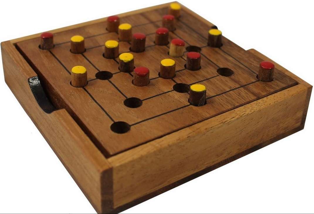 Un jeu passionnant de stratègie à deux joueurs ! L’objectif sera d’essayer, comme au morpion, de réaliser une ligne de 3 pions (horizontale, ou verticale), et dans le même temps, de tenter de bloquer l’autre joueur pour l’empêcher de réaliser une ligne. Lorsque vous réalisez une ligne, vous pouvez enlever un pion adverse de votre choix. Vous gagnez si votre adversaire n’as plus que 2 pions ou moins.