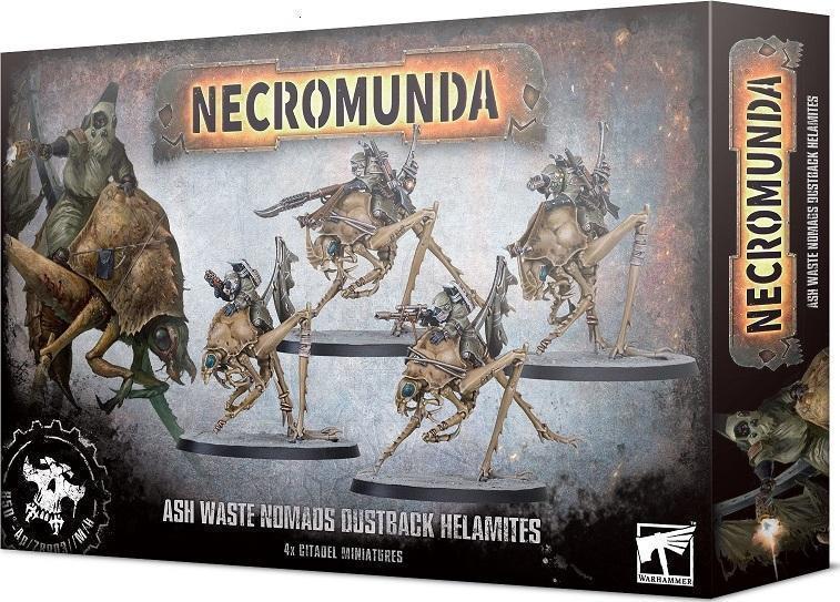 De mémoire d’homme, il y a toujours eu des Nomades des Désolations de Cendre vivant dans les Grandes Désolations Équatoriales. Contrairement aux proscrits et aux fouisseurs, ces survivants solides sont nés dans les désolations, et se sont adaptés à la vie dans un environnement aussi inhospitalier. Ayant renoncé aux véhicules, qui nécessitent un entretien permanent et des ateliers fixes, les Nomades préfèrent dompter les macro-insectes qui vivent dans les désolations, appelés Dustback Helamites. Ces créatures se meuvent rapidement dans les dunes mouvantes en emportant des cavaliers adroits, ce qui apporte une vitesse bondissante et une puissance dévastatrice lors des raids. Ce kit plastique vous permet d’ajouter des Dustback Helamite Riders à votre gang d’Ash Waste Nomads. Ce set de quatre figurines offre de nombreuses options d’équipements et pièces cosmétiques, pour vous aider à créer des gangers montés uniques, et inclut : - 4x corps d’Helamite et de cavalier nomade, avec deux types différents pour chacun, vêtus de guenilles pesantes et couverts d’équipements - 2x cornes optionnelles pour deux des têtes d’Helamite - 8x têtes de cavalier nomade de quatre types différents - 4x hampes de selle, de deux types différents ; un avec un écran en lambeaux, l’autre avec des équipements attachés - Plein d’armes ! 2 fusils éclateurs, 2 long fusils, 2 pistolets éclateurs, et 2 lances tronçonneuses Ce set se compose 80 pièces plastique et est fourni avec 4x socles ovales Citadel de 75mm. Ces figurines sont fournies non peintes et nécessitent assemblage – nous recommandons d’employer la Colle Plastique Citadel et la peinture Citadel. Une liste de gang basique et une liste d’armes pour les Ash Waste Nomads sont incluses dans le livret d’assemblage de Necromunda : Ash Wastes.