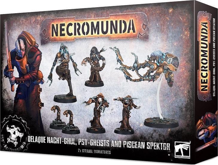 Un Nacht-Ghul est un assassin doublé d’un saboteur sans égal. Fruit de la science psychique et de l’alchimie, c’est le tranchant qui occit les ennemis des Delaque dans le noir – ou les ennemis de leurs amis si cela sert leurs desseins. Les gangs Delaque comprennent souvent des agents talentueux de ce genre, tout en sachant que le Nacht-Ghul obéit en définitive à la Chambre Stellaire et aux murmures de la Psychoterica. Agrandissez votre gang Delaque avec ces sept combattants supplémentaires. Ces agents discrets de la Maison Delaque sont dotés d’un équipement spécialisé varié pour mieux exécuter leurs sinistres besognes. Les deux Nacht-Ghuls peuvent être armés d’une surineuse ou d’un crochet de serpent, et un des Psy-Gheists porte un harnais de psychomancien. À l’exception des Psychoteric Wyrms, qui servent de nœud psy à leurs maîtres, tous les combattants sont des psykers, qui confèrent à votre gang un avantage tactique considérable. Ce kit est fourni en 98 composants permettant d’assembler les sept figurines suivantes : - 2x Nacht-Ghul (Champions, fournis avec 2x socles Necromunda de 25mm) - 2x Psy-Gheists (Prospects, fournis avec 1x socle Necromunda de 32mm et 1x socle Necromunda de 25mm) - 2x Psychoterric Wyrms (Exotic Beasts, fournis avec 2x socles Necromunda de 25mm) - 1x Piscean Spektor (Brute, fourni avec 1x socle Necromunda de 40mm et 1x tige rainurée de 45mm) Les règles pour jouer les Nacht-Ghul, Psy-Gheists, Psychoteric Wyrms, et le Piscean Spektor dans les parties de Necromunda se trouvent dans Necromunda : House of Shadow. Ces miniatures sont fournies non peintes et nécessitent un assemblage - nous vous recommandons d’utiliser la colle plastique Citadel et les peintures Citadel.