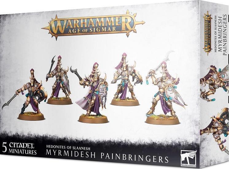 Les Myrmideshs forment un culte de guerriers d’élite et incarnent l’orgueil du Prince du Chaos. Chaque secte considère que sa technique de prédilection est la meilleure, et lors des rares occasions où on leur prouve le contraire, ils sombrent dans une rage terrible. Ajoutez une unité de fantassins gracieux et mortels à votre armée d’Hedonites of Slaanesh. Nantis des meilleures armures et de lames cruelles, ils dansent tout en taillant en pièces les formations adverses. On peut assembler une des figurines sous forme de Painmaster, afin de mieux semer la douleur. Ce kit plastique en 86 composants permet d’assembler cinq Mymidesh Painbringers à l’usage de Warhammer Age of Sigmar. Il est fourni avec cinq socles ronds Citadel de 32mm. On peut sinon en faire des Symbaresh Twinsouls.