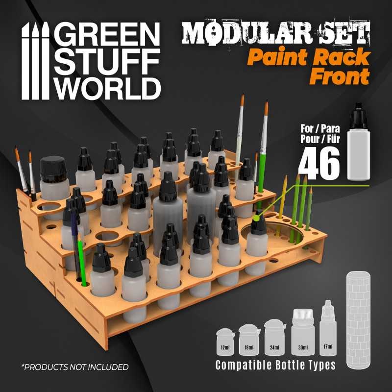 Présentoir Modulaire pour Peinture - FRONTAL Présentoir de bouteilles de peinture fabriqué en bois MDF de haute qualité. L’assemblage pour ce présentoir est rapide et simple. Si vous souhaitez le renforcer, nous vous recommandons d’utiliser une colle blanche Standard. Cet ensemble comprend des pièces de connexion pour pouvoir le joindre à d’autres modules à gauche et à droite. Il est également compatible avec les modules de tiroir GSW. Les trous intérieurs vous permettent de placer les pots de peinture à la fois debout et à l’envers. Mesures : 30cm long x 20cm large x 10cm haut Capacité par combinaison : - 46x bouteilles de peinture 17ml - 34x bouteilles de peinture 17ml + 12x bouteilles de peinture 30/10/18 ml - 34x bouteilles de peinture 17ml + 5x bouteilles de peinture 30/10/18ml + 7x rouleaux texturés