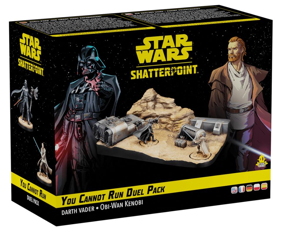 Un set de duel permettant de rejouer un affrontement d’anthologie, celui de Obi-Wan contre Dark Vador ! Dans Tu ne peux pas fuir se trouvent deux figurines, l’une représentant Obi-Wan Kenobi, Sorti de la clandestinité, et l’autre Dark Vador, Chasseur de Jedi. Le premier est dans une période sombre de sa vie, après l’exécution de l’Ordre 66. Cette itération d’Obi-Wan Kenobi en tant qu’Unité Secondaire plutôt que Principale représente parfaitement son état diminué lorsqu’il sort de la clandestinité. Toutefois, les braises de son ancien pouvoir de maître Jedi brûlent toujours en lui, et cette version d’Obi-Wan Kenobi peut être ajoutée aux escouades de l’époque de la Guerre des Clones ou de la Guerre Civile Galactique. Dark Vador, Chasseur de Jedi représente l’émergence de ce personnage sur la scène galactique, après s’être remis de blessures presque mortelles. Il a abandonné l’identité d’Anakin Skywalker et a pleinement embrassé le côté obscur sous la direction de son mentor et maître, l’Empereur. Désormais à la tête des Inquisiteurs et habilité à détruire les derniers vestiges des Jedi. Cette version de Dark Vador peut être ajoutée aux équipes de l’ère Guerre des Clones et Guerre Civile Galactique en tant qu’unité principale. Star Wars Shatterpoint : Tu ne peux pas fuir contient deux figurines non peintes à monter, 1 décor de présentation, 2 cartes posture de combat, cartes ordre, 2 cartes statistiques. Nécessite une boîte de base de Star Wars Shatterpoint