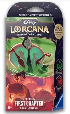 EMERAUDE/RUBIS Pour jouer à Disney Lorcana, chaque joueur a besoin d’un deck de soixante cartes. Les decks de démarrage prêts à jouer contiennent un deck préconstruit avec une liste de cartes spécifique. Si vous êtes novice en matière de jeux de cartes à collectionner, ou si vous souhaitez expérimenter le jeu avec un deck conçu et testé par l’équipe Lorcana, c’est un bon point de départ. Chaque deck de démarrage contient : 1 deck de 60 cartes, dont 2 cartes brillantes des personnages figurant sur le recto de l’emballage 11 jetons de jeu 1 livret de règles 1 booster contenant 12 cartes aléatoires