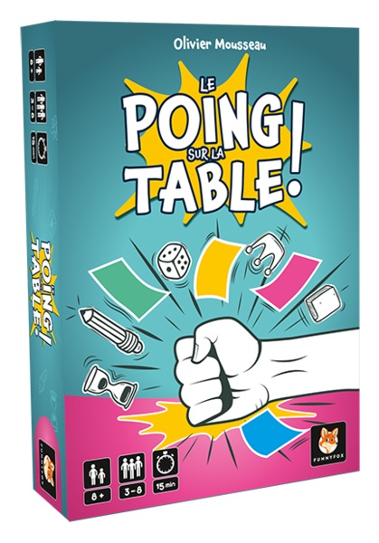 Dans LE POING SUR LA TABLE, les joueurs vont, à tour de rôle, devoir faire une proposition à voix haute répondant à des critères imposés par les cartes posées au centre de la table. Les critères s’accumulent jusqu’à ce qu’une proposition soit invalidée par les autres joueurs qui… taperont du poing sur la table (oui, pour de vrai !) Des jetons sont donnés en guise de pénalité et le joueur qui en aura le moins en fin de partie sera désigné vainqueur ! Nombre de joueurs : 3 - 8 joueurs Age : A partir de 8 ans Durée de jeu : 15 mn Points forts : Dynamique et fun ! Un jeu où il faudra argumenter pour vous en sortir et taper du poing pour faire entendre votre voix !