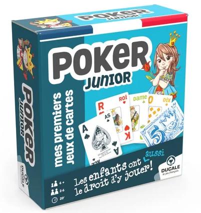 Rois, Reines, Valets et autres valeurs ont été redessinés dans un esprit enfantin et ludique. Ainsi grâce à son livret de règles de jeu, apprenez progressivement à jouer aux poker et aux différentes variantes : de la classique à la version comptoir ! Contenu du produit : 1 jeu de 55 cartes Poker, 1 livret de règles, des cartes billets, 1 dépliant de cette gamme dédiée au Junior.
