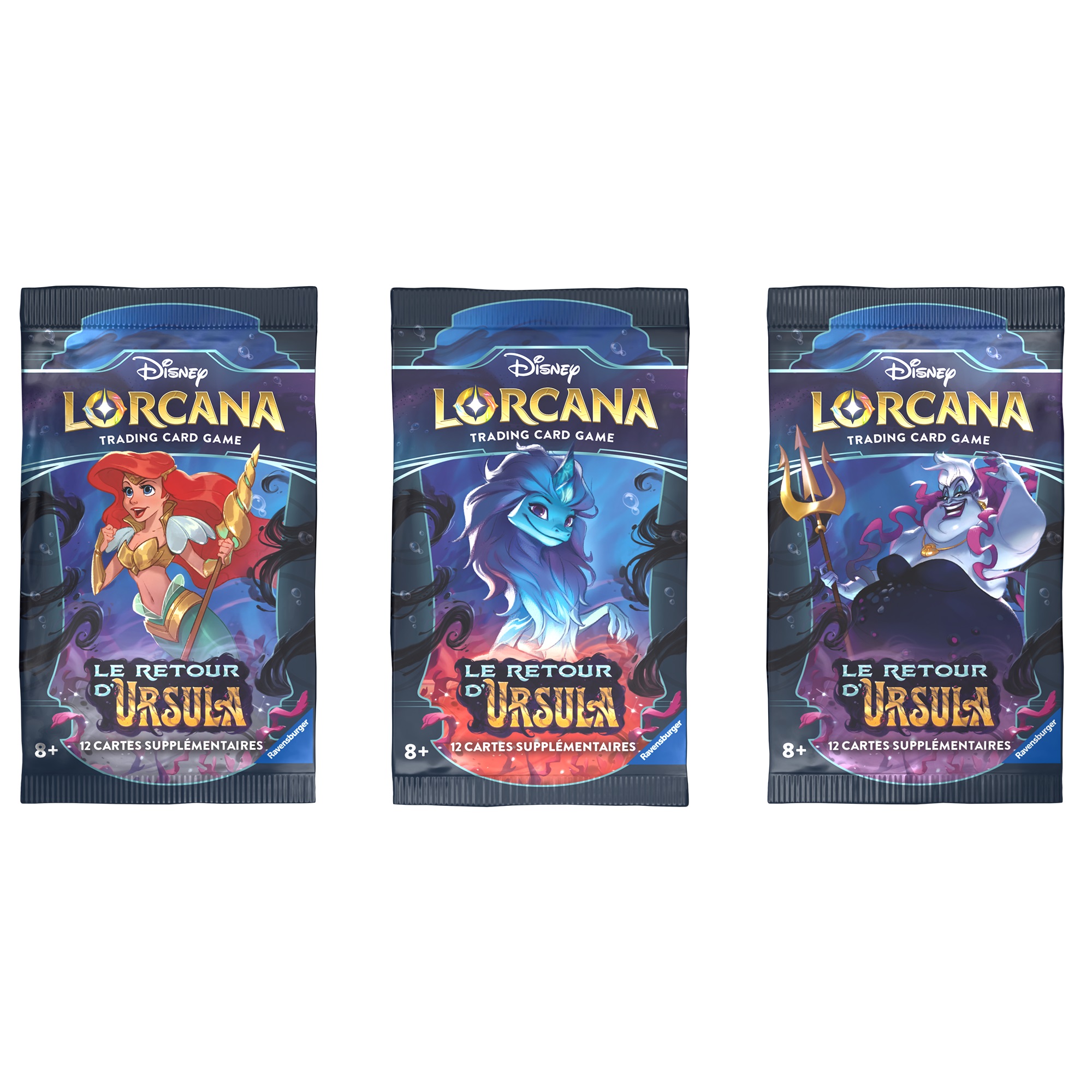Vivez l’émotion d’ouvrir un booster scellé Disney Lorcana ! Avec ses 12 cartes, ce booster Disney Lorcana : Le Retour d’Ursula vous fournira des cartes pour personnaliser votre deck actuel. Échangez avec vos amis pour multiplier les possibilités ! Découvrez de nouvelles cartes, renforcez vos stratégies et libérez le pouvoir de vos personnages préférés. Il existe 3 visuels de couverture de sachet différents, sans lien avec le contenu. Visuel aléatoire lors de la livraison. Chaque booster est composé de - 6 cartes communes - 3 cartes inhabituelles - 2 cartes rare, très rare ou légendaire - 1 carte brillante de rareté aléatoire parmi les plus de 200 cartes différentes de Disney Lorcana Chapitre 4 : Le Retour d’Ursula