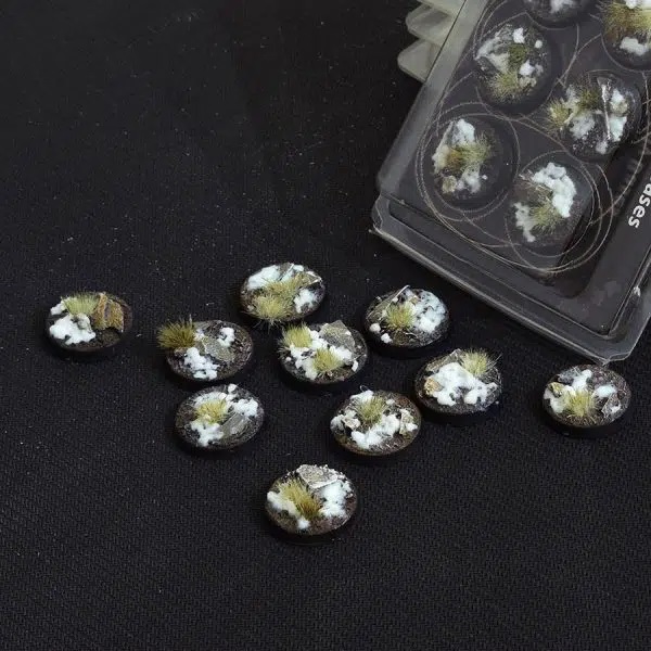 Environnements froids et rocailleux recouverts de neige partiellement fondue et de quelques touffes non saturées. Ces socles simulent avec réalisme les climats froids ainsi que les habitats saisonniers froids d’hiver/début de printemps avec une végétation clairsemée. Ce pack contient 10 socles prêts pour la bataille de forme ronde, d’une largeur de 25 mm, dans un thème hivernal. Tous les socles prêts pour la bataille sont vendus déjà peints et finis à la main.