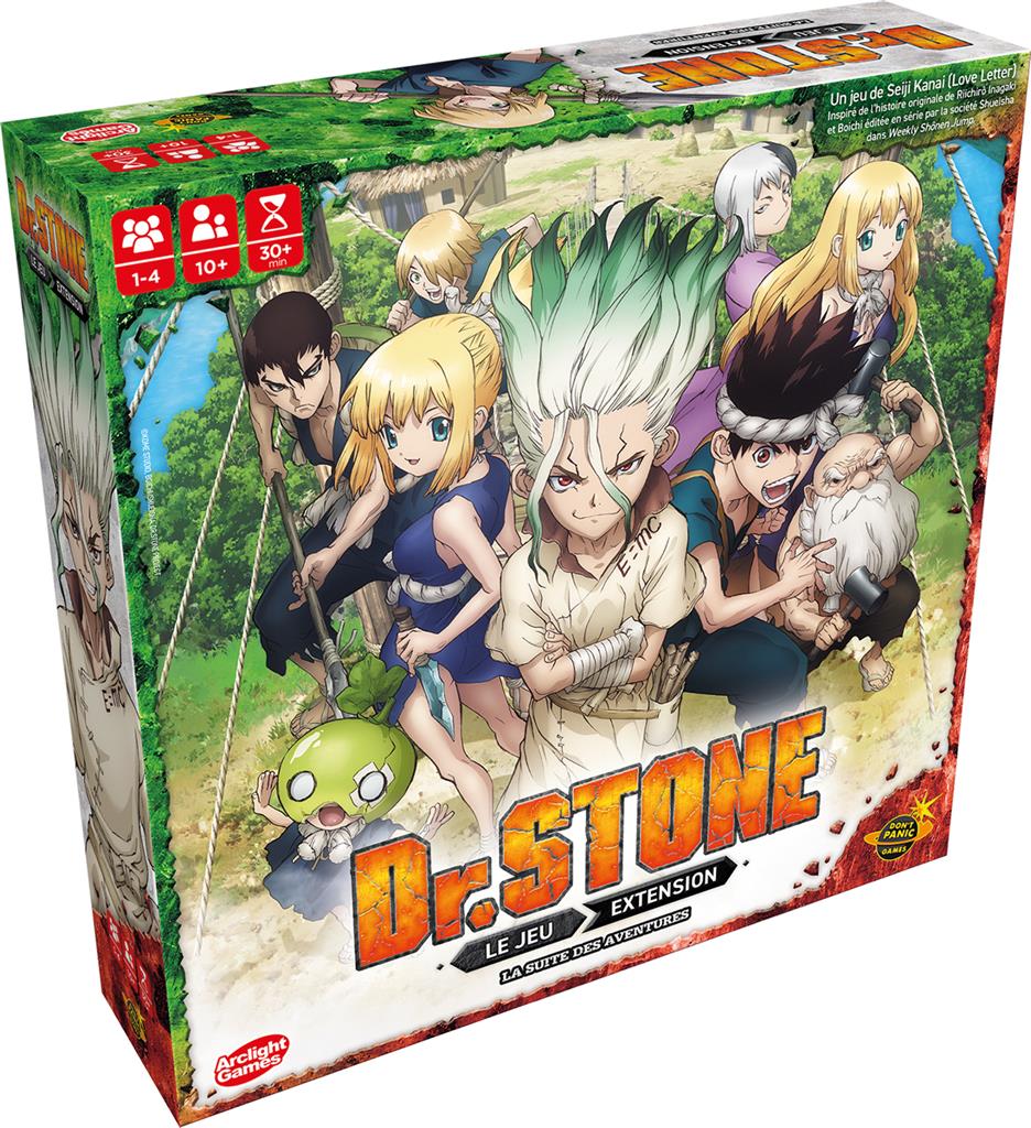 Dr Stone est un jeu coopératif. Il sera difficile de gagner votre première partie, mais les défaites vous aideront à emprunter le chemin de la réussite. Au fur et à mesure des épisodes, la difficulté ainsi que le nombre de tâches à accomplir augmenteront. Chaque joueur incarne un personnage et a pour mission de rapporter des éléments éloignés du village à Senku. Vous transformerez ces éléments jusqu’à l’obtention de l’objet requis pour clore chaque épisode. Pendant ce temps, Shishio Tsukasa et ses sbires vous guetteront car eux ne souhaitent pas le renouveau de la civilisation. Prenez garde, ils pourront vous attaquer à tout moment ! De plus, si vous dépassez le temps imparti, vous échouez. Au fil des épisodes, vous apprendrez à transformer les cartes Matériaux pour créer de nouvelles cartes Objet. Cette boîte contient 2 aventures supplémentaires pour des heures de plaisir. Nécessite une boîte de base. Contenu 1 plateau de jeu, 6 cartes Personnage, 7 tuiles Personnage, 7 socles, 35 cartes Épisode, 94 cartes Objet, 105 cartes Matériaux, 10 cartes Senku, 10 tuiles Installation, 14 tuiles Ennemi, 16 jetons Villageois, 18 jetons AP, 3 tuiles (X), 5 dés, 25 cubes en bois, 3 livrets de règles