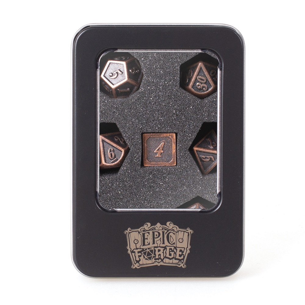 Set de 7 dés métal 1 x D4 1 x D6 1 x D8 1 x D10 (unité) 1 x D10 (dizaine) 1 x D12 1 x D20 Taille D6 pour référence : 14mm Dans leur boite métal Epic Forge