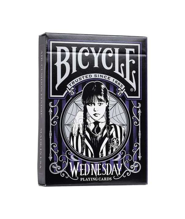 Plongez dans le monde sombre de Nevermore Academy avec Bicycle Wednesday cartes à jouer ! Inspiré de la série à succès de Netflix mettant en vedette Jenna Ortega dans le rôle de Wednesday Addams ; votre prochain jeu de cartes est entièrement dédié à la danse palpitante avec le macabre, alors que vous mélangez les cartes noires d’encre présentant les personnages favoris des fans de la série.