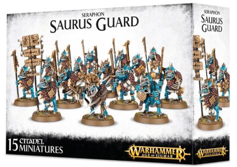 Les Gardes Saurus constituent une caste de défenseurs d’élite consacrés à la protection des chefs et des sanctuaires des Séraphons. Patients et obstinés, ces guerriers à sang-froid ne permettront pas que les Astrocrates dont ils doivent assurer la protection soient blessés tant qu’un seul d’entre eux respire encore. Tous combattront jusqu’au dernier pour défendre leur maître en découpant à l’aide de leurs hastes de célestite tout ennemi assez fou pour approcher.