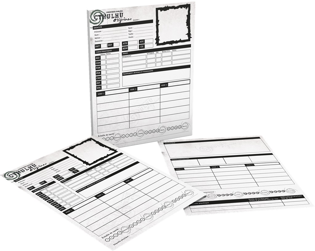 Ce bloc contient 20 feuilles de personnage recto verso format A4 à utiliser pour vos parties de Chroniques Oubliées Cthulhu Origines.