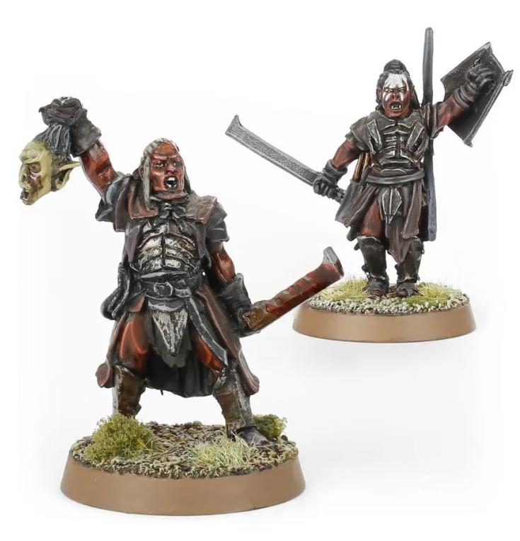 Ces Héros Uruk-hai sont de solides chefs pour leurs brutaux congénères. Lurtz est armé d’un arc, d’un bouclier et d’un cimeterre Uruk-hai, tandis qu’Uglûk tient un cimeterre ensanglanté et la tête de l’Orque qui vient de le contrarier.