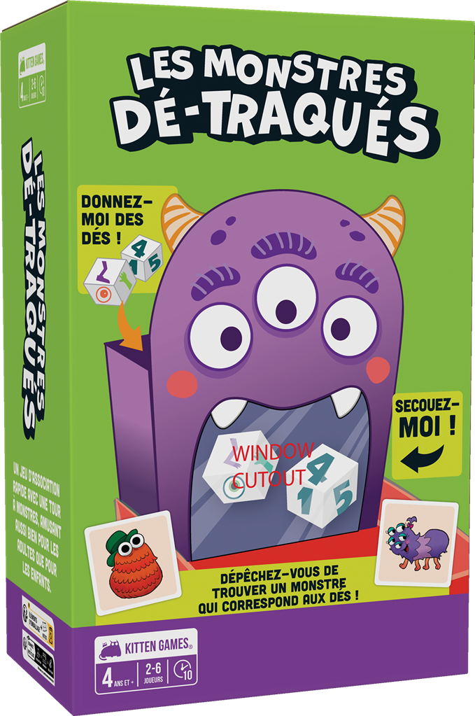 Les Monstres Dé-traqués est un jeu d’association et de rapidité pour toute la famille, jouable dès l’âge de quatre ans. Pas besoin de savoir lire : il suffit de lâcher les dés dans la Tour à Monstres, d’identifiez dessus les bons critères (nombre de bras, yeux, jambes...) et les retrouver parmi les cartes Monstre au milieu de la table.