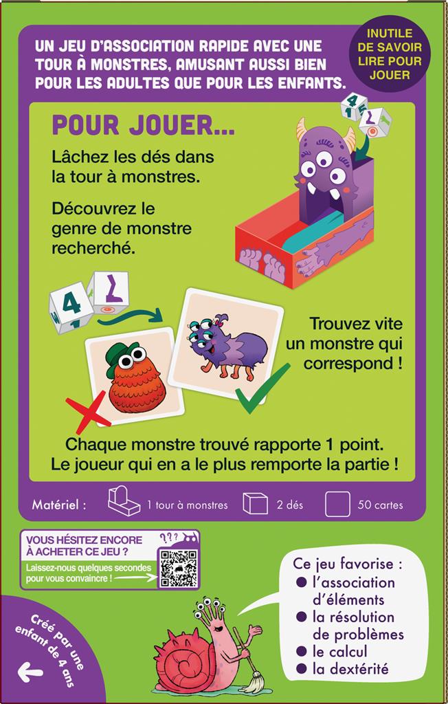 À chaque tour de jeu, des cartes Monstre sont tirées au hasard et étalées faces visibles, au centre de la table. Le joueur actif secoue la tour contenant les dés, puis la repose. Chacun doit ensuite trouver un monstre correspondant. Le premier dé indique un nombre (y compris 0), le second une caractéristique : bras, jambe ou œil. Mettez votre doigt sur une carte de Monstre correspondant aux résultats des dés pour la gagner et remporter 1 point. Plusieurs monstres peuvent correspondre, mais il n’y en aura pas forcément pour tout le monde ! Un jeu super amusant mais qui permet mine de rien de renforcer la reconnaissance visuelle, la logique, le calcul simple et la motricité fine. Grâce à ses règles simples et à son matériel coloré, c’est le choix idéal pour initier les plus jeunes au jeu de société.