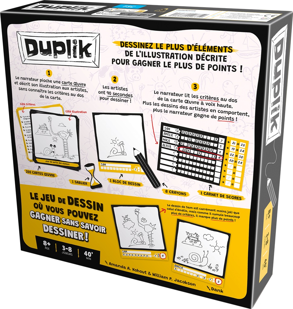Dans Duplik, l’un des participants joue le rôle du maître d’œuvre. Sa mission : décrire une illustration rigolote en donnant aux autres joueurs autant de détails que possible.