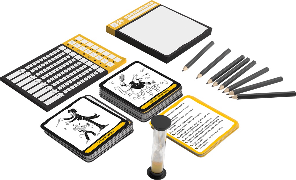 200 cartes, 8 crayons, 1 sablier, 1 carnet de score, 1 rodoïde rouge, 1 livret de règles
