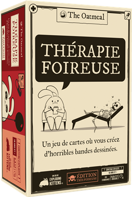 Conçu par The Oatmeal (le célèbre auteur de BD) et les créateurs d’Exploding Kittens, Thérapie Foireuse est un jeu à l’humour noir délibérément trash, réservé aux adultes. Avec plus de 400 cartes, chaque partie est unique. Âmes sensibles s’abstenir ! Les autres s’amuseront...comme des petits fous !