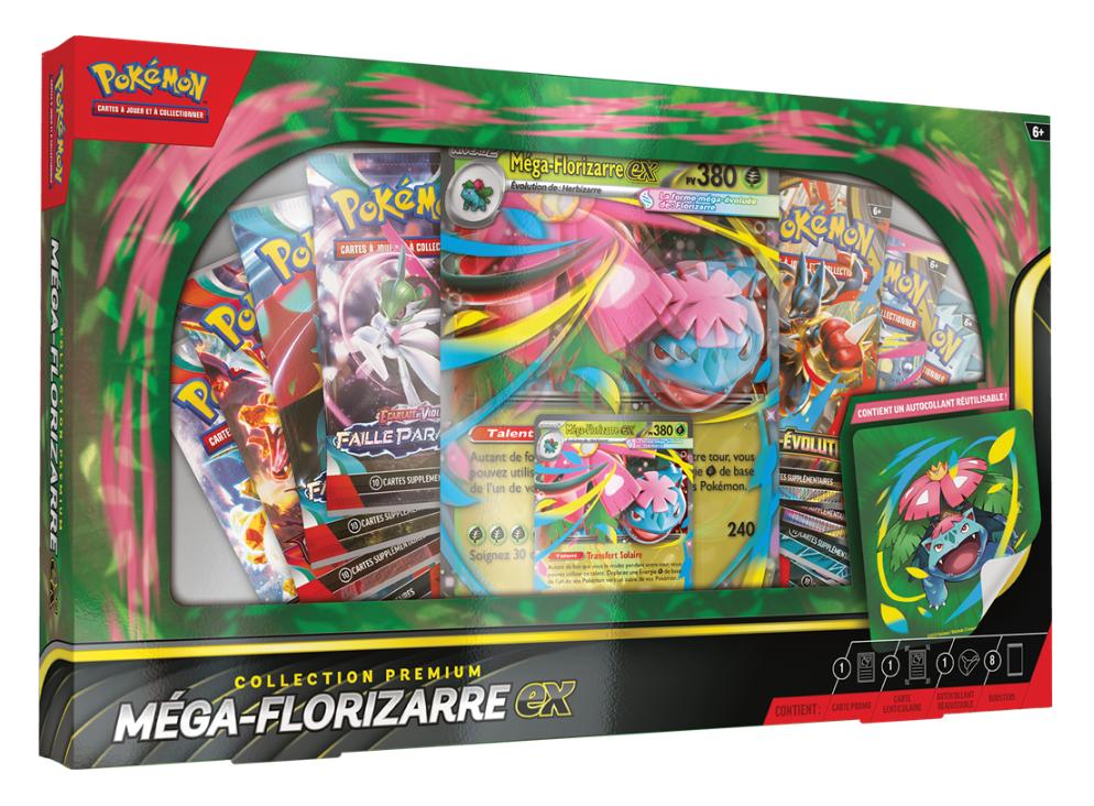 1 carte promo brillante de Méga-Florizarre-ex, 1 carte promo grand format lenticulaire de Méga-Florizarre-ex, 1 autocollant réajustable à l’effigie de Méga-Florizarre, 8 boosters du JCC Pokémon