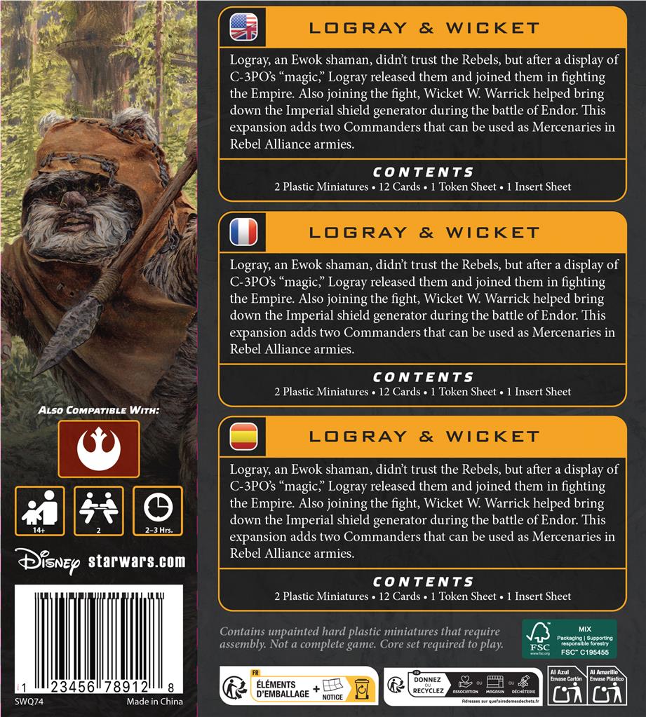 Ajoutez à votre armée Logray et Wicket W. Warrick, deux guerriers Ewoks emblématiques du Retour du Jedi. Logray ne faisait pas confiance aux Rebelles, mais après une démonstration furieuse de la « magie » de C-3PO, il les libéra et se joignit à eux dans leur combat contre l’Empire. Wicket W. Warrick prit part lui-aussi à la Bataille d’Endor en aidant à désactiver le générateur de bouclier Impérial.