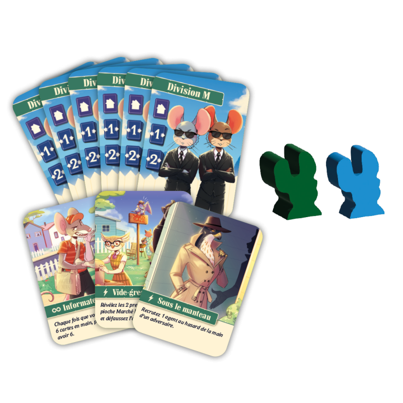 Agent Avenue – Division M est une extension passionnante, qui introduit un tout nouveau type d’agent : les souris de la Division M. Ces agents rusés créent une zone dangereuse autour de votre espace de jeu, ajoutant ainsi une nouvelle dimension stratégique, du suspense et du piquant à chaque partie d’Agent Avenue.