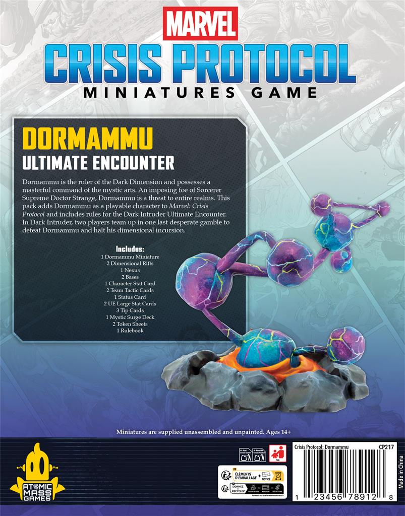 Cette extension pour Marvel : Crisis Protocol™ contient un nouveau personnage : Dormammu, ennemi juré du Docteur Strange. Ce souverain de la Dimension Noire, qui possède une maîtrise magistrale des arts mystiques, est une redoutable menace pour de nombreux royaumes. Découvrez également un scénario coopératif, Ultime Rencontre, dans lequel deux joueurs devront vaincre Dormammu dans une tentative désespérée pour stopper son incursion dimensionnelle. Les joueurs constituent une Équipe de Crise composée de plusieurs escouades pour combattre la menace lors de missions narratives appelées Rencontres. Chacune de ces Rencontres précise le nombre de cartes tactique d’équipe ainsi que la taille d’escouade pour chaque joueur. La boîte contient la figurine de Dormammu et 3 éléments de décor (Nexus et deux figurines de Failles Dimensionnelles). Figurines à monter et non peintes.